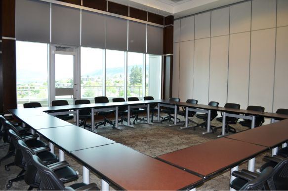 Centrally located on campus, this flexible event space can be divided into three smaller rooms to suit the needs of your gathering. Warm wood accents and abundant natural light from oversized windows create an inviting atmosphere, while a private patio offers guests exceptional views of the Kamloops valley. This flexible space is ideal for meetings, workshops and social gatherings.