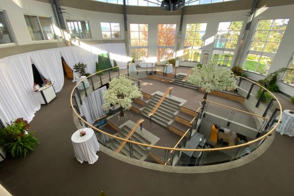 Situated at the heart of the Campus Activity Centre, this distinctive circular venue blends modern design with warm wood and brick accents—creating a striking backdrop for any event. Expansive windows fill the space with natural light and offer sweeping views of the TRU Campus Commons, bringing the outdoors in. As the building’s central corridor, this space naturally supports the smooth flow of attendees while seamlessly connecting our venues for tradeshows, cocktail receptions, and networking breaks.
